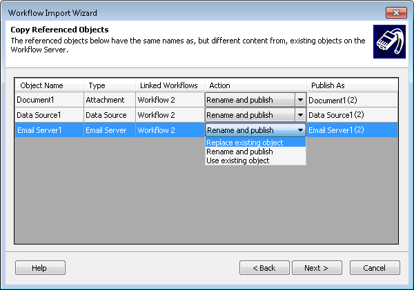 Copy Referenced Objects screen will appear when you import workflows with certain objects: attachments, data sources, web services, or specially configured e-mail servers that have the same name as objects already on the Workflow Server. This screen shows the object's name, its type, and the workflow it is associated with. In the Action column you can choose to: - Rename and publish: If you select this option, you can type a new name for the object in the Publish As column. The workflow will be published with the provided object name.