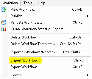 - Double-click the Workflow Import File (.wfi) file. Alternatively, in the Workflow Designer, select Import Workflow under