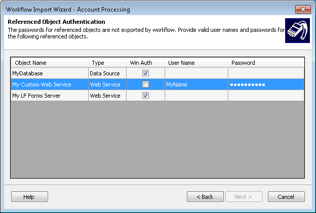 Referenced Object Authentication screen will prompt you to provide passwords for those objects. Select the checkbox under Win Auth to use the Windows Authentication credentials of the current user. Clear this checkbox to type a user name and password in the User Name and Password columns. Provide valid user names and passwords for all listed reference objects, and click OK. - After configuring the names and publish status for the workflows, starting rules, and objects, click Next.