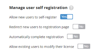 - When the Allow new users to self-register option is toggled to Yes, two additional toggle options appear: