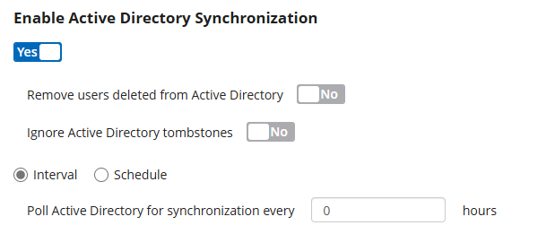 Note: When the Poll Active Directory for synchronization every value is set to 0, Active Directory synchronization will occur every 30 minutes after the service is started.