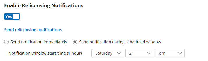 Turn on the Enable Relicensing Notifications option to send notifications to registered instances of Laserfiche Forms (versions 10.4 and later) and Laserfiche Server (versions 10.4 and later) when there is a change in the primary license. Choose between sending the update notification immediately or during a scheduled time window. Laserfiche Forms and Laserfiche Server can then attempt to automatically retrieve an updated application license.