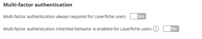 - MFA inherited behavior is enabled for Laserfiche Users: Turn on this option to turn on MFA for Laserfiche Users with an MFA status set to Inherited.