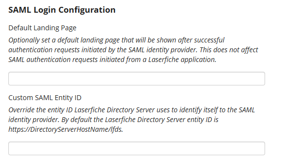 Note: The Default Landing Page and SAML Entity ID fields are optional for most SAML authentication configurations, including those for Shibboleth, Okta, and Microsoft Entra ID.