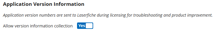 Application version numbers may be sent to Laserfiche during licensing for troubleshooting and product improvement. Administrators can choose to turn this feature on or off by setting the Allow version information collection to Yes or No.