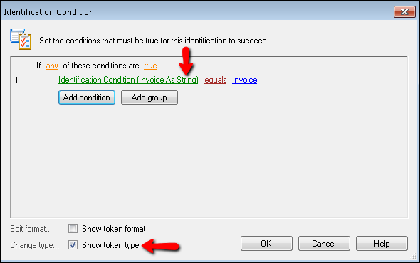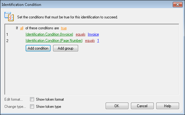 .Example: KPC has two different types of invoice forms that are very similar. The only difference is the word "Invoice" and the words "Invoice Number: XXXX" are in different locations. In Pre-Classification Processing, they add a Zone OCR process that will check both possible locations for the word "Invoice" and the other two possible locations for the words "Invoice Number: XXXX." KPC wants the invoices identified as such if either of the following condition groups are true. They configure the group to any to accomplish an "either" logic. Then, they create two groups of conditions that use the all group text because all the conditions in either condition group need to be met in order for the invoice to be identified correctly. Group one specifies that the condition group is true if a zone on the right side of the form equals "Invoice" AND another zone on the right side of the page, the invoice number, is not empty. Group two specifies that the condition group is true if a zone on the left side of the form equals "Invoice" AND another zone on the left side of the page, the invoice number, is not empty. If either of these condition groups meet all the criteria contained within each group, the invoice will be identified correctly.
