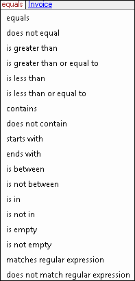 - Operator Text: Click these links to specify the logic of the condition: the relationship between the token specified in the condition token text and the value entered to the right. The operators available in this list depend on the condition token text.