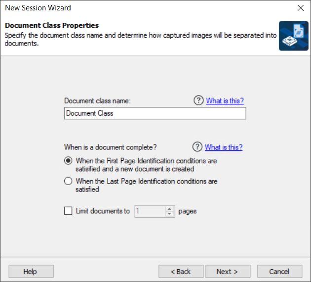 The standard wizard is designed for users who are generally familiar with creating a session but prefer a moderate amount of help. It guides you through the process of configuring most, but not all, session settings, such as selecting (but not configuring) a scan source, creating a document class (excluding the configuration of sample pages), session permissions, selecting how unidentified documents should be handled, and specifying when processed documents should be sent to the repository. Settings that are not defined in the wizard should be manually configured once the session is created.