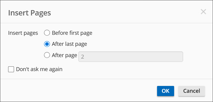 - Specify whether you want the newly-scanned pages to be inserted before the first page of the existing document, after the last page, or at a certain point in the document.