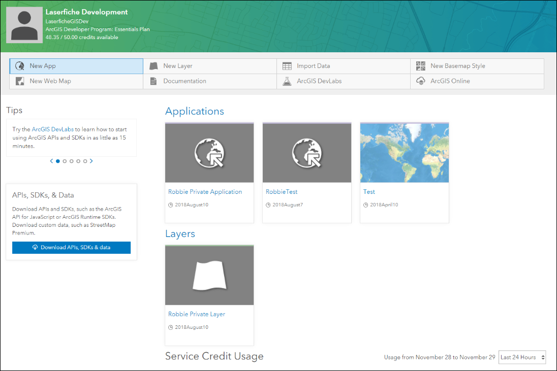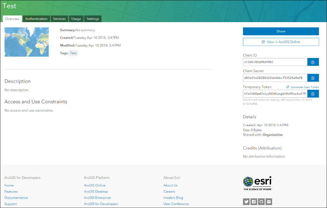 - Navigate to https://developers.arcgis.com/dashboard, create an application and give it any name and description.