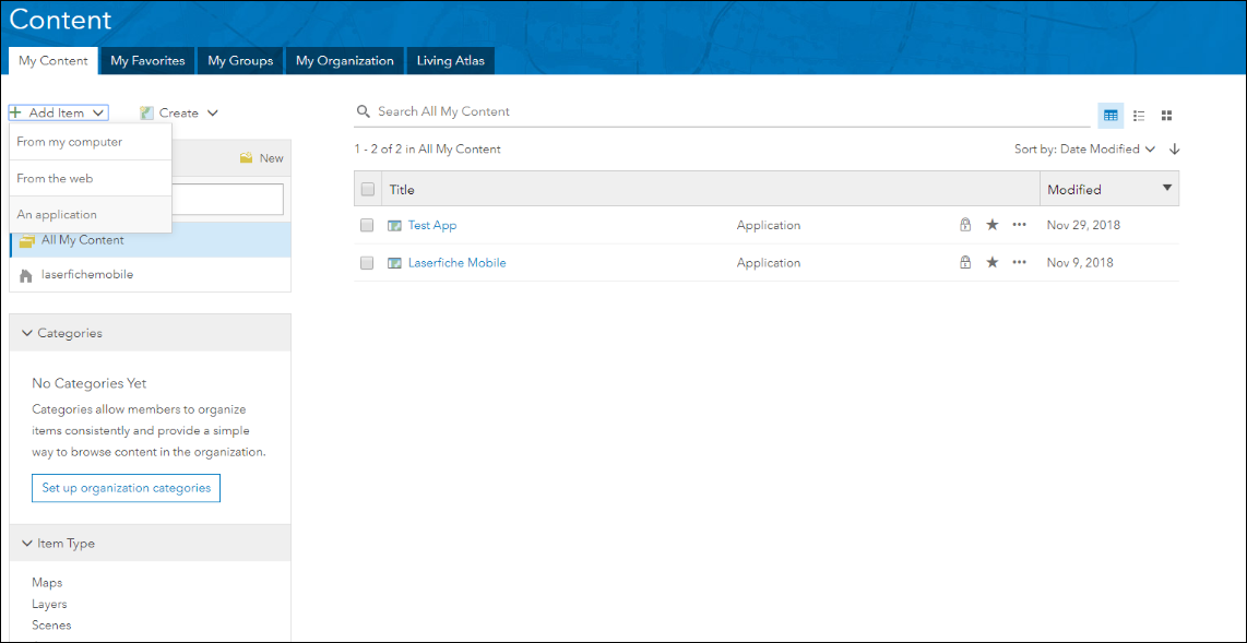 - Navigate to your portal and click the Content tab. Click Add Item, then select An application.