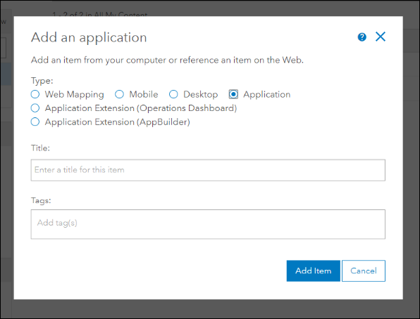 - Select the Application option, enter an appropriate title and tags, then click Add Item to create the application.