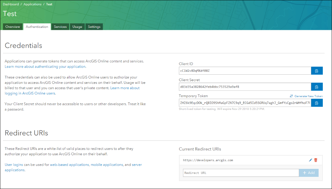 - Next to Client/App ID and Redirect URL, you will need to enter the Client ID and Redirect URL obtained when creating an application in either the ArcGIS Developer Dashboard (for ArcGIS Online) or your portal (for ArcGIS Enterprise).