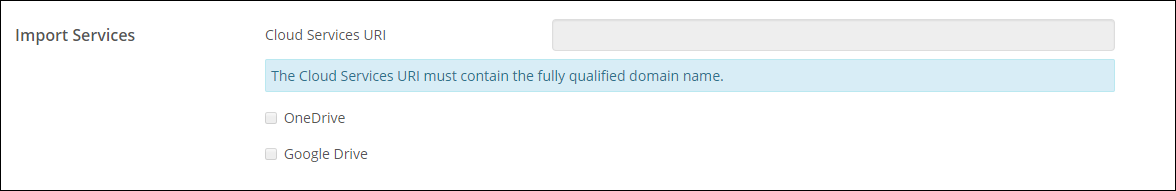 To allow users to import directly from OneDrive or Google Drive, an administrator will need to configure the Cloud Services URI. In most cases, this will be https://LaserficheMobileServer/CloudImportServices. For your Laserfiche Mobile Server name, you should provide the fully-qualified domain name. Once configured, you can choose to enable OneDrive or Google Drive.