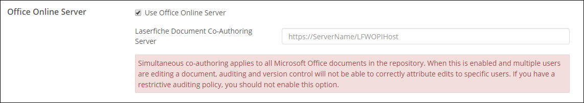 The Laserfiche Document Co-Authoring Host for Microsoft Office provides an integration point with Microsoft Office Online Server to support simultaneous editing of Microsoft Office documents in a repository. To enable simultaneous co-authoring of Microsoft Office documents, you must have access to an Office Online Server, and you must also install the Laserfiche Document Co-Authoring Host for Microsoft Office. Once you have done so, you can enable and configure co-authoring on the web client and/or mobile server configuration pages.