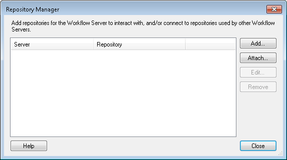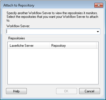 Attach to Repository dialog box, type or select the Workflow Server that is currently monitoring the repository you want to connect to and monitor as well. - The repositories monitored by the Workflow Server you selected will appear under Repositories. Select the repository you want to connect to.