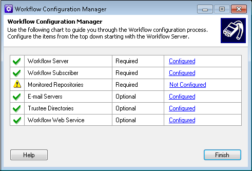 Note: In the Workflow Configuration Manager, if the link next to Monitored Repositories says Needs Prerequisite, you must first configure a Workflow Server before configuring monitored repositories.