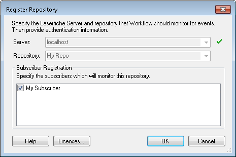 Register Repository dialog box, select the subscribers that will monitor the selected repository. - Optional: Click Licenses to configure license information. More information.