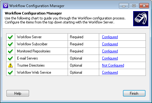 Note: If the link next to Trustee Directories says Needs Prerequisite, you must first configure a Workflow Server and Monitored Repositories before configuring trustee directories.