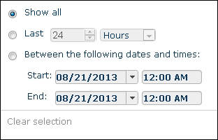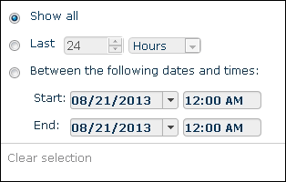 You can filter instances of schedules by their starting dates and/or times. For example, if you want to show the instances a schedule ran in the last 30 minutes, select Last, enter 30 in the first box and select Minutes from the drop-down menu.