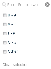 Each schedule contains a session. You can type a specific session name to show schedules containing that session, or select a checkbox corresponding to the first letter or number of the session's name. If the name starts with a character other than a letter in the English alphabet (A - Z) or number (0-9), select Other. |
