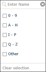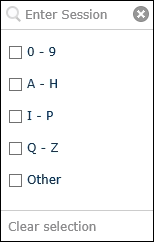 Each schedule contains a session. You can type a specific session name to show schedules containing that session, or select a checkbox corresponding to the first letter or number of the session's name. If the name starts with a character other than a letter in the English alphabet (A - Z) or number (0-9), select Other.
