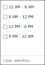 You can filter schedules by the time they start. For example, if you want to show all schedules that started between 6 AM and 12 PM, select the 6 AM - 12 PM checkbox.