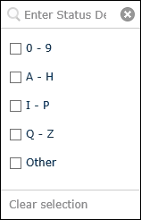 Each time a schedule runs, a description of its status is recorded. Type a specific description or select a checkbox corresponding to the first letter or number of the description. If the description starts with a character other than a letter in the English alphabet (A - Z) or number (0-9), select Other.