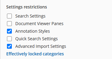 Settings restrictions allow you to restrict settings by user or group, or to lock settings for everyone. In addition, you can restrict any combination of the settings restrictions categories. For example, you might want to restrict both the document viewer panes and the advanced import settings for the Sales group, the advanced import settings but not the document viewer panes for the Scanner Operators group, and the search settings for everyone. You could do so by setting different attributes for the various groups.
