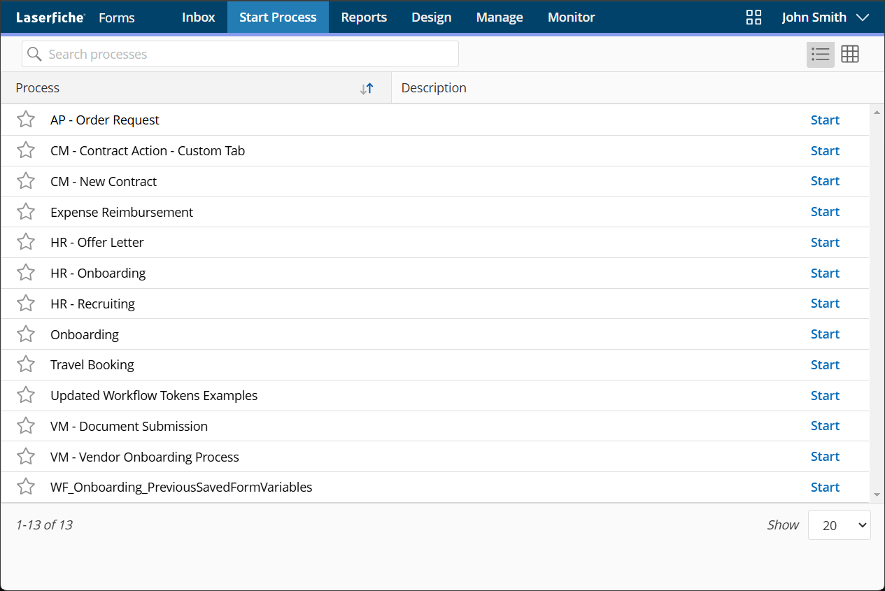 You can configure the way the processes are displayed using the options on the top right. The List View option lists many processes at one time. The Grid View option displays fewer processes, but it lets you view a thumbnail of the form you are starting.