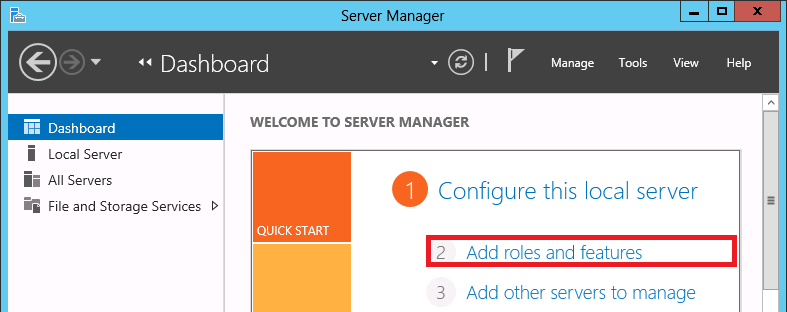 Server Manager dialog box, select Add Roles and Features from the center pane. - In the Add Features Wizard, click Next.