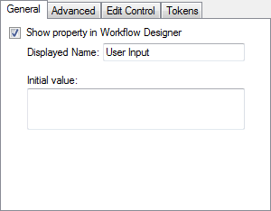 Show me what this looks like. - Initial value: Type or choose the initial value that your property will have when your custom activity is added to a workflow. This option will look different depending on your property’s type.