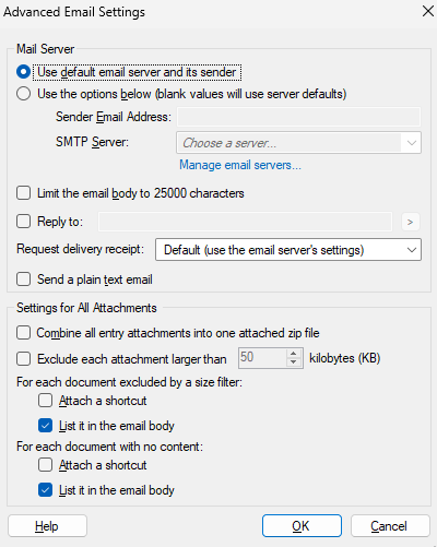 Note: This setting can be overridden by the attachment size limit in Document Attachment Properties and Folder Attachment Properties.