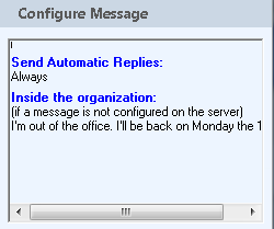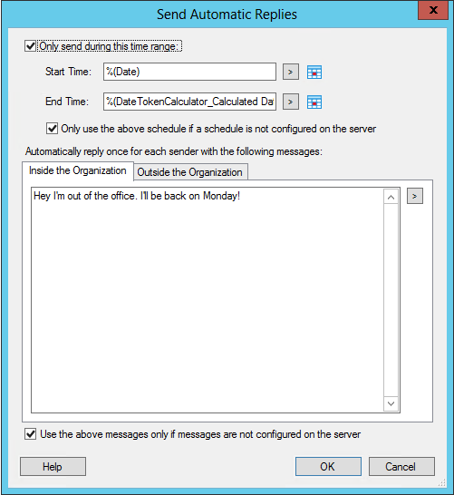 Send Automatic Replies dialog you can set the time range and message for your Automatic Reply message. - Checking Use an existing time range... will first check if a time range is set up on the account and use it if available. If this box is unchecked the time range specified in the activity will always be used