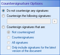 - Countersign the following signatures: Only countersign the signatures specified, ignoring all other signatures. Type one or more signatures to countersign in the text box, and/or click the Token button (right arrow)