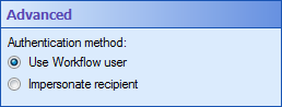 - Impersonate recipient: Workflow will authenticate to Exchange as the user account specified in the Assign To property box. This option requires a domain administrator to grant delegation rights in Active Directory to the account specified in the Server property box.