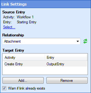 - Select Warn if link already exists to report a warning in the Messages Tab of the instance details if the activity tries to link two entries that already have the specified relationship.
