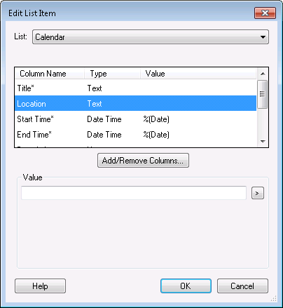 - In the Edit List Item dialog box, select a column and enter a value for the column under Value. Click the Token button (right arrow)