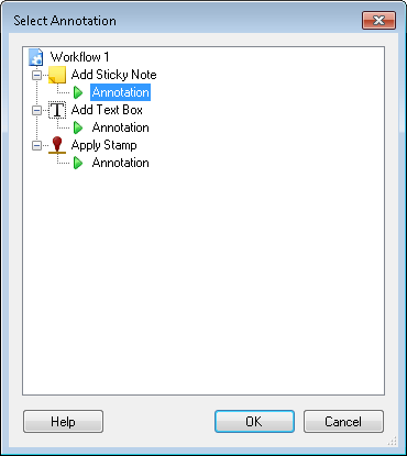 The Delete Annotation activity's Annotation to Remove property box lets you delete an annotation that the Add Sticky Note, Add Text Box, or Apply Stamp activity added to a document earlier in the workflow.