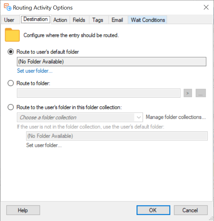 - Route to user's default folder: Routes entries to the user's default working folder, listed in the read-only property box under this option.