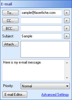 - Optional: For additional e-mail options, click Email Editor to open the Email Configuration dialog box. Or, click Advanced Settings to open the Advanced Email Settings dialog box.