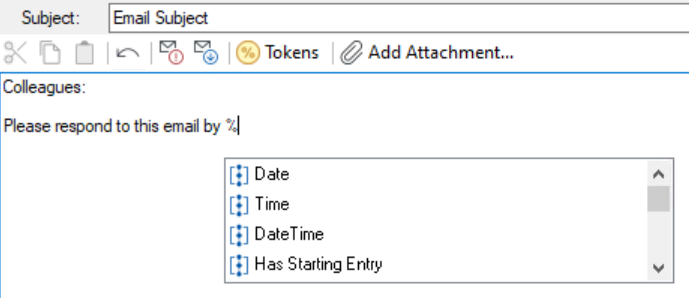 Tip: Start typing a token with the %(TokenName) format in the body of an e-mail, and a list of tokens appears as you type.