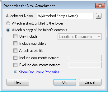 Note: If you are attaching the folder as a shortcut or zip file, the name in the Attachment Name box becomes the name of the shortcut or zip file. If you are attaching the folder as a folder, the Attachment Name box renames each document attachment with the specified name. Therefore, we recommend to leave the name set to the default token if you are not attaching the folder as a shortcut or zip.