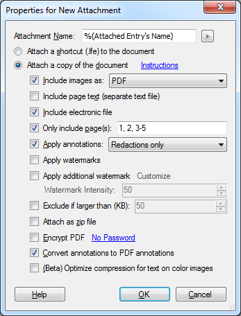 - Apply annotations: Specifies what annotations are included in the attachment. You can choose Redactions only, All other annotations, or All annotations from the drop-down menu. This option has no effect on electronic documents.