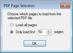 PDF Page Selection dialog box will appear. Select to load all of the PDF's pages or to only load the first ___ number of pages. If you choose to load only a specific number of pages, type in a number of pages or use the scroll box (up-and-down arrows)