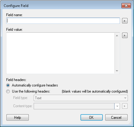 - By default, this activity will automatically configure headers for each field. If you are inserting a file, html, or css, you may want to select Use the following headers to provide custom header values. If you specify that the field type is Text, specify which type of text field with the Content-type drop down menu. If you specify that the field type is File, specify the type of file, how it is encoded (if at all), and the file's name. If you leave any headers blank, they will automatically be filled when the activity runs.