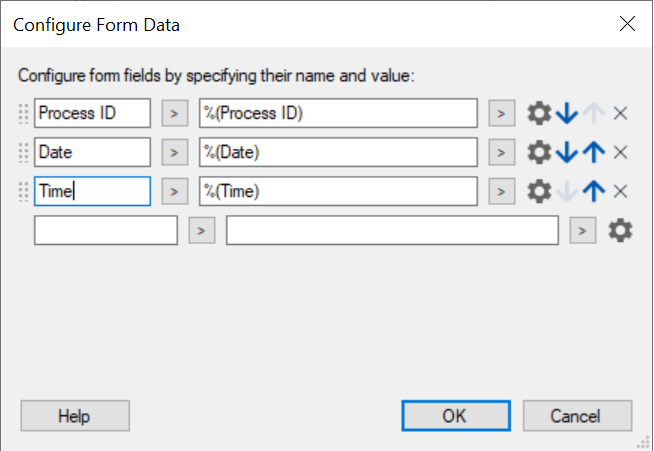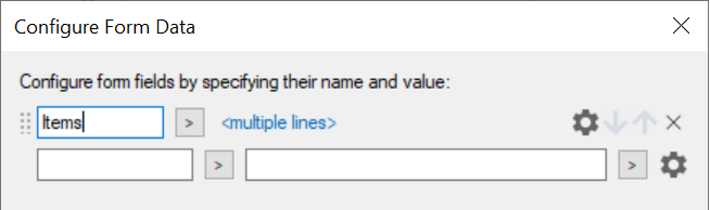 Configure Form Data dialog box. - Provide a name and value for each form field you want this activity to fill out. Click the Token button (right arrow)