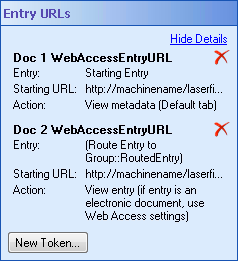 Entry URLs property box allows you to configure URLs for the Laserfiche web client entries. The Generate Web Client URLs activity makes these URL available as tokens.Note: You can only create eight Entry URL tokens with a single Generate Web Client URL activity.