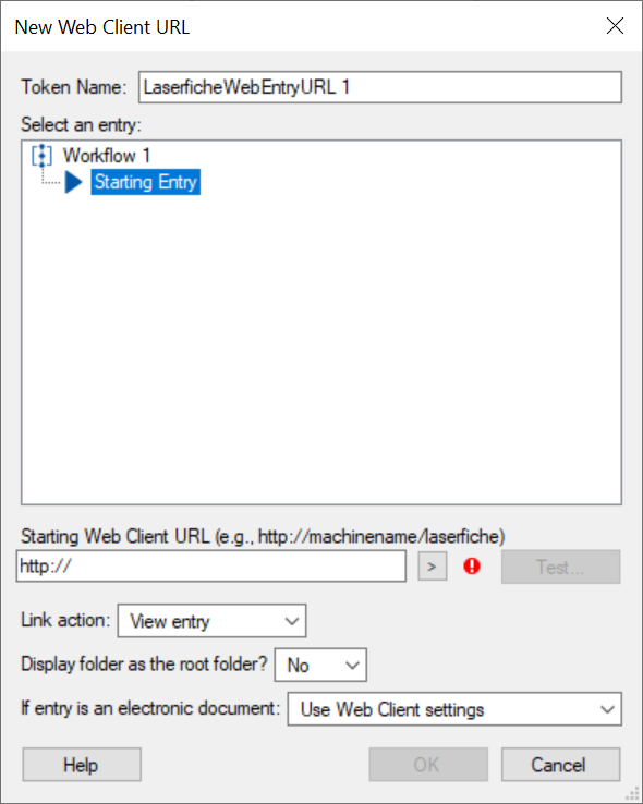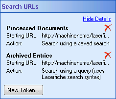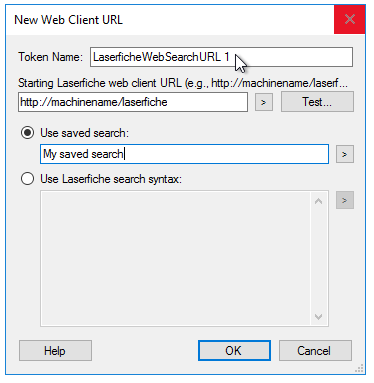 New Web Client URL dialog box, type a name for your Search URL token in the Token Name text box. - Under Starting Web Client URL, type the URL for your the Laserfiche web client start page (e.g., http://machinename/laserfiche).