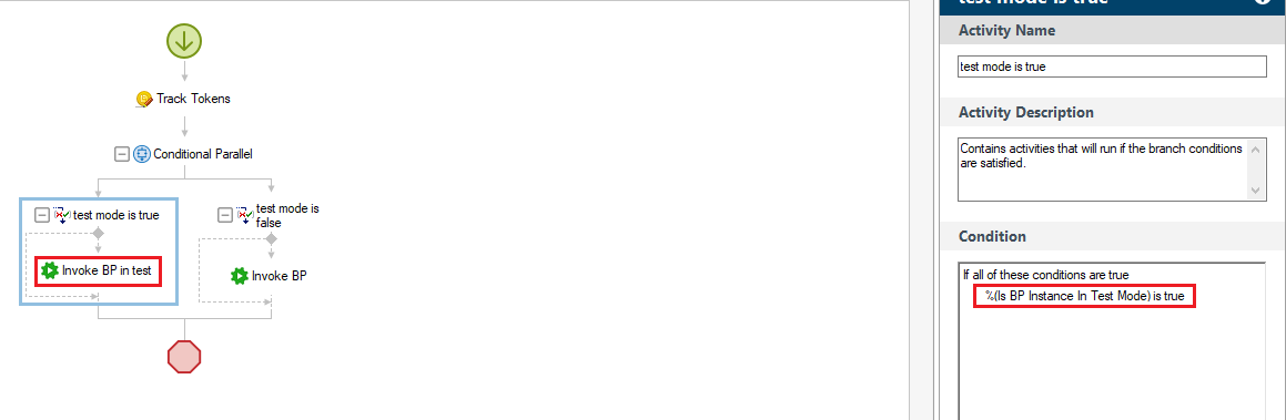 Note: Check 'Started by Laserfiche Forms' in 'View Properties‘ for the workflow, and use %(Is BP Instance In Test Mode) to determine the activity if running in test mode.